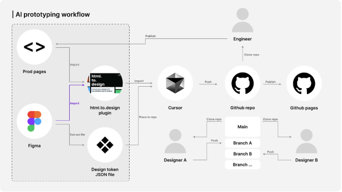 기존 프로덕트와 이미 존재하는 디자인을 AI한테 전처리한 다음에 제공해서 AI가 회사의 프로덕트와 디자인 시스템에 대한 이해를 바탕으로 아웃풋을 제공하면 디자이너가 이를 바탕으로 아웃풋을 개선하고, 엔지니어의 리뷰 후 프로덕트에 적용할 수 있도록 만든 워크플로우입니다.