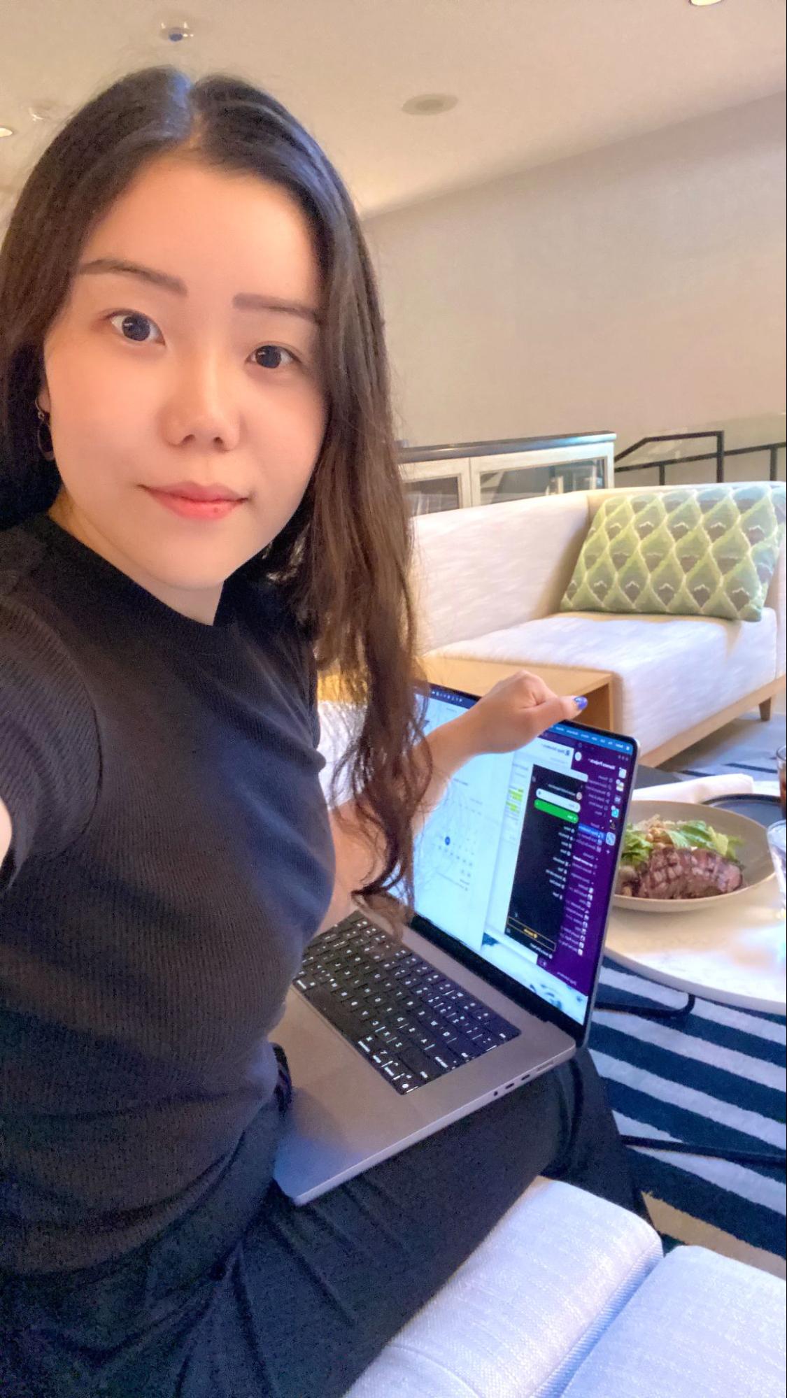 [맥북을 펴고 일하는 레이첼 님의 모습]